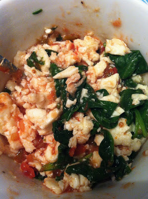 I thought I could wait until I got to SRD so that I could just grab some freshly made breakfast, but I started getting pretty hungry around 7:30 this morning, so I whipped up a quick batch of my usual scrambled egg whites to eat before heading to work.